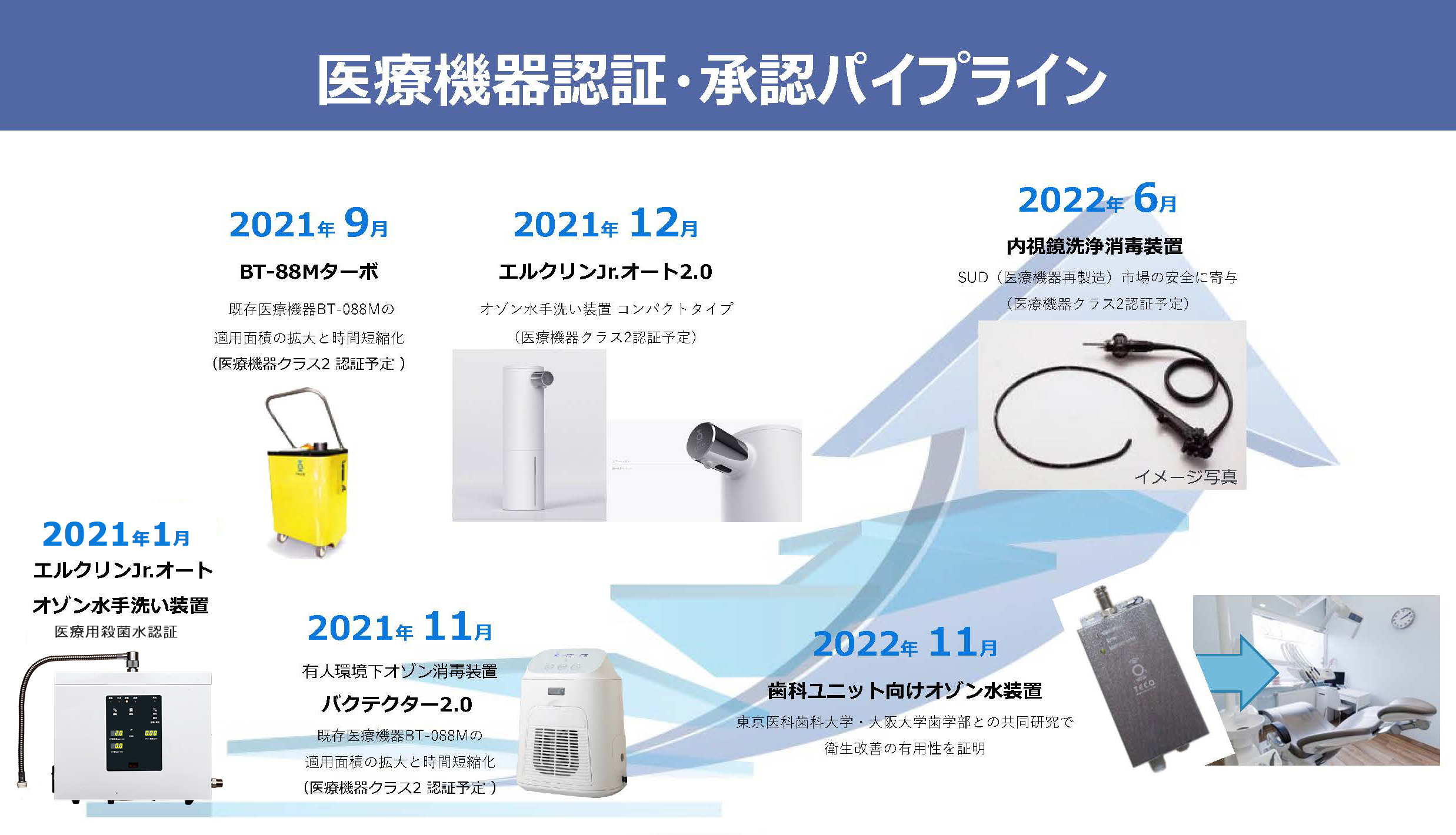 2021年 1月:エルクリンAUTO3 医療用殺菌水装置(オゾン水) (医療機器クラス2 認証 ) 認証済 2021年 9月:BT-88Mターボ 既存医療機器BT-088Mの適用面積の拡大と時間短縮化 2021年 11月:有人環境下オゾン消毒装置 バクテクター2.0 2021年 12月:エルクリンJr.オート2.0 オゾン水手洗い装置 コンパクトタイプ 2022年 6月:内視鏡洗浄消毒装置 2022年 11月:歯科ユニット向けオゾン水装置 |