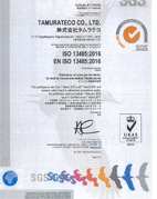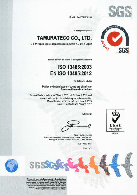 株式会社タムラテコは、「医療機器の品質マネジメントシステムに関する国際規格」であるISO13485の認証企業として、オゾンガス消毒器、医療用殺菌水(オゾン水)の両医療機器販売の認証を取得しています。