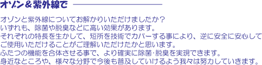 オゾンガス・オゾン水・オゾン氷・紫外線による殺菌消臭機器の製造販売の業界最大手メーカー タムラテコのサイトです。