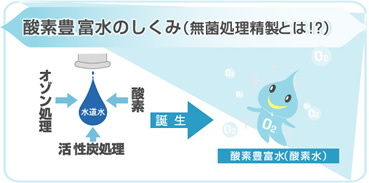 特許を取得したエジェクター技術により、当社独自のオゾン処理した水に更に酸素を充填しました。純貴水は通常の水道水の酸素量(3〜5mg/L)に比べ、約5倍(15〜20mg/L)の酸素を溶解させた浄水・富酸素水です。