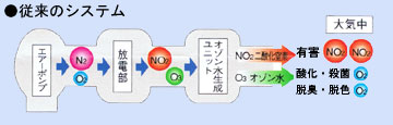 | 従来のオゾン発生方法は、オゾンを生成させる電子放電部へ空気をそのまま送り込むため、有害な二酸化窒素が発生していました。新開発の酸素濃縮器(PSA方式)を本体に内蔵することにより、窒素酸化物の少ない酸素だけをオゾン生成の原料にすることに成功しました。 |