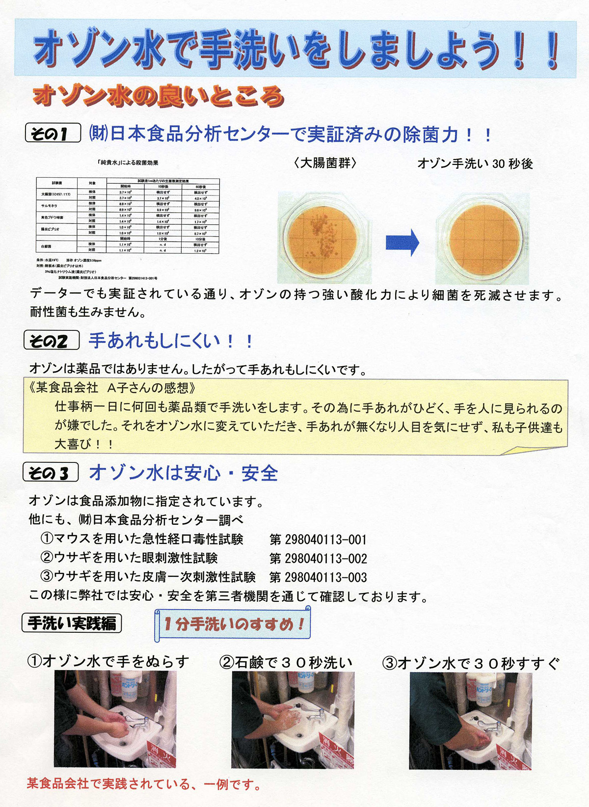 INDEX(2008年5月30日更新) 第15回 のこり湯ですすぐ洗濯機 節水需要を開拓・・・・・・・・・・・・・・・・・・・・・・・・・・・・・・・・・・2008/5/30 第14回 フォーブス オゾンで青果を消毒する・・・・・・・・・・・・・・・・・・・・・・・・・・・・・・・・・・・・・・・2008/5/19 第13回 身近なオゾンの使用法と今求められいること・・・・・・・・・・・・・・・・・・・・・・・・・・・・・・・・・2008/2/7 第12回 オゾン漂白、CO2と薬品の削減〜究極のエコ技術・・・・・・・・・・・・・・・・・・・・・・・・・・・・2007/11/10 第11回 レジオネラ菌の恐怖とその対策・・・・・・・・・・・・・・・・・・・・・・・・・・・・・・・・・・・・・・・・・・2007/10/26 第10回 燃料高騰とコスト削減、地球とユーザーに優しく。・・・・・・・・・・・・・・・・・・・・・・・・・・・・・2007/10/10 第9回 緊急企画 競走馬の洗浄除菌について、馬インフルエンザの脅威・・・・・・・・・・・・・・・・・・2007/08/20 第8回 オゾン水で手洗いをしましょう!!・・・・・・・・・・・・・・・・・・・・・・・・・・・・・・・・・・・・・・・・・・・・・・・・2007/06/26 第7回 オゾン水活用マニュアル!!正しい洗い方!!・・・・・・・・・・・・・・・・・・・・・・・・・・・・・・・・・・・・・2007/06/05 第6回 オゾン発生器による顔面紅賞皮症型アトピー性皮膚炎の治療成績について(PDF)・・・・・・・・2007/06/04 第5回 ノロウイルス(SRSV)にはオゾン水が有効! 飲食店の食中毒防止にはオゾン水・・・・・・・・2006/12/04 第4回 大都市「まずい」返上 巨額投じハイテク浄水(日経新聞 朝刊より)・・・・・・・・・・・・・・・・・・2006/09/10 第3回 今使える機能水を徹底比較!水道水の残留塩素は体に悪影響?・・・・・・・・・・・・・・・・・・・・2006/08/10 第2回 ”空気で洗う”の実力は?オゾンエアウォッシュ洗濯機の効果・・・・・・・・・・・・・・・・・・・・・・・・2006/08/01 第1回 大阪の水「まずくない」高度処理 質はOK(朝日新聞 2006/04/17付夕刊より)・・・・・・・・・2006/07/20 |